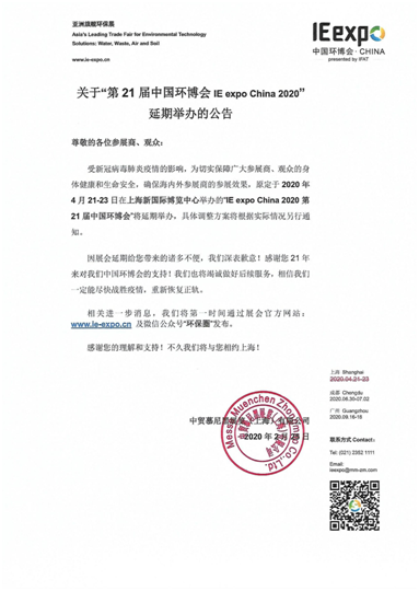 2月26日,中國環(huán)博會主辦方發(fā)布《關(guān)于“第21屆中國環(huán)博會IE expo China 2020”延期舉辦的公告》并宣布,原定于2020年4月21-23日于上海舉辦的第21屆中國環(huán)博會延期舉辦,“延期后的具體時間將另行通知”。