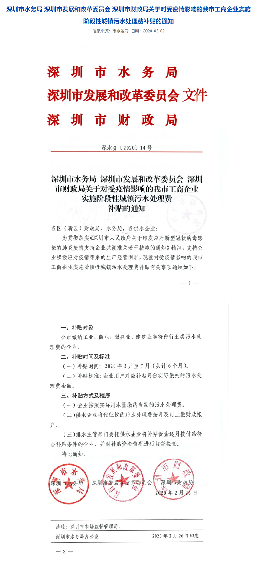 深圳將給工商企業(yè)補(bǔ)貼 6 個(gè)月的城鎮(zhèn)污水處理費(fèi)。2 月 27 日,從深圳市水務(wù)局獲悉,為支持企業(yè)積極應(yīng)對(duì)疫情帶來(lái)的生產(chǎn)經(jīng)營(yíng)困難,深圳對(duì)受疫情影響的工商企業(yè)實(shí)施階段性城鎮(zhèn)污水處理費(fèi)補(bǔ)貼,將對(duì)企業(yè)用戶對(duì)應(yīng)補(bǔ)貼月份實(shí)際繳交的污水處理費(fèi)金額。