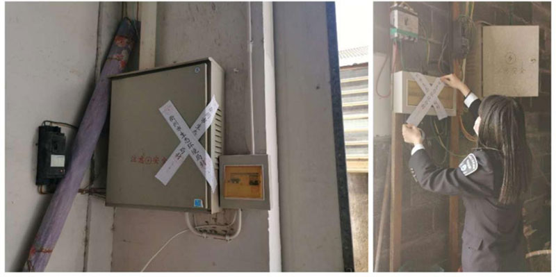 執(zhí)法人員依法對(duì)龍游康和飾品有限公司生產(chǎn)用電配電箱及電源開關(guān)進(jìn)行查封。