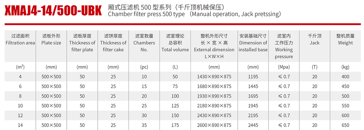 金凱地壓濾機廠家研制的千斤頂污泥壓濾機參數如下:(產品詳情可以在產品中心的廂式壓濾機500型系列了解)
