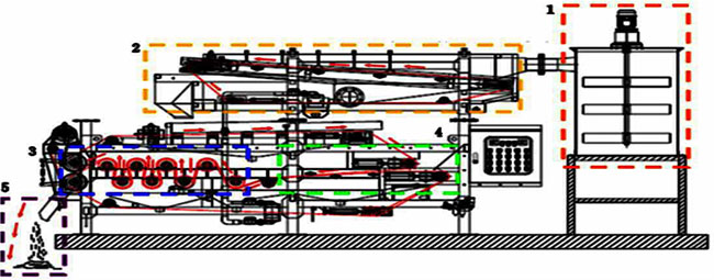 1-化學(xué)預(yù)處理脫水段;2-重力濃縮脫水段;3-楔形區(qū)預(yù)壓脫水段;4-擠壓輥高壓脫水段;5-物料排出段