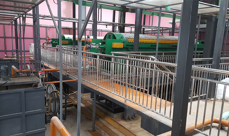 (2)重力濃縮脫水段:絮凝后的污泥經(jīng)布料斗均勻送入網(wǎng)帶,污泥隨濾帶向前運(yùn)行,游離態(tài)水在自重作用下通過濾帶流入接水槽。