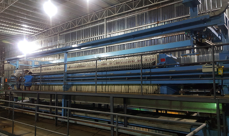 ②、高壓低能耗 : 整機機架、濾板均采用高強度優質鋼,經特別防腐處理,經過數控加工后組成一體式高密封性能的濾室和機架 , 足夠滿足 100kg/cm2 以上高壓壓榨要求 ; 系統 設計采用低壓進料、高壓壓榨的階梯式壓榨,階段式循序漸進的提升壓榨壓力,克服了濾講自身因含水率降低帶來的過濾比阻,縮短了過濾周期降低能耗,提高了工作效率。
